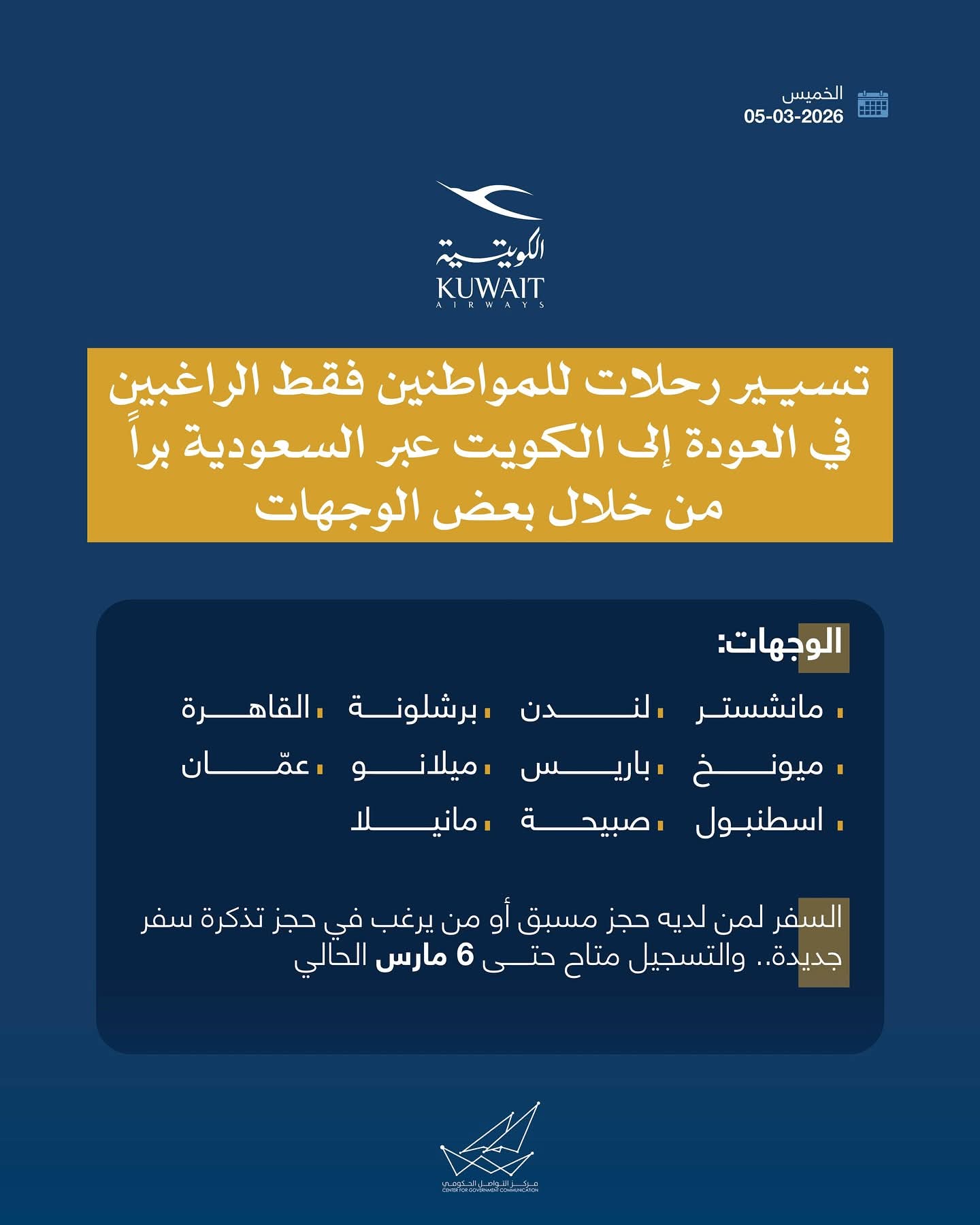 أعلنت الخطوط الجوية الكويتية تسيير رحلات مخصصة للمواطنين الراغبين في العودة إلى البلاد عبر المملكة العربية السعودية براً، وذلك انطلاقاً من عدد من الوجهات الدولية، في إطار تسهيل عودة المواطنين في ظل الظروف الراهنة.