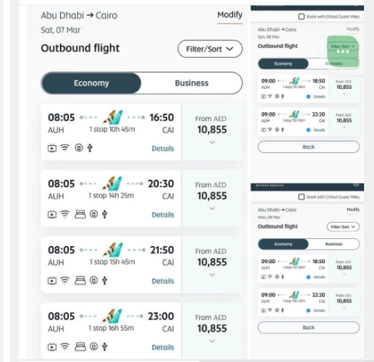 وفي إطلاع سريع لأسعار تذاكر رحلات مصر للطيران المتاحة أثناء كتابة التقرير إلى عدة وجهات بلغت رحلة مصر للطيران إلى أبو ظبي قرابة 47 ألف جنيه، بحسب موقع حجز الشركة، وبلغ سعر تذكرة مصر للطيران إلي دبي ذهاب وعودة قرابة 50 ألف جنيه، وإلى جدة 28 ألف وإلى الرياض 19 ألف، والكويت 25 ألف، الدمام 25 ألف، البحرين 36 ألف، في مراحل الذهاب والعودة.