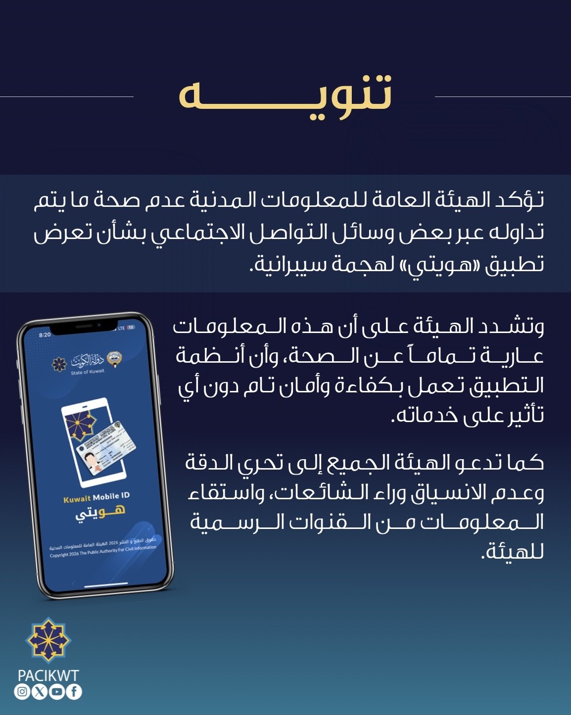أكدت الهيئة العامة للمعلومات المدنية في الكويت عدم صحة ما يتم تداوله عبر بعض منصات التواصل الاجتماعي بشأن تعرض تطبيق «هويتي» لهجمة سيبرانية.
