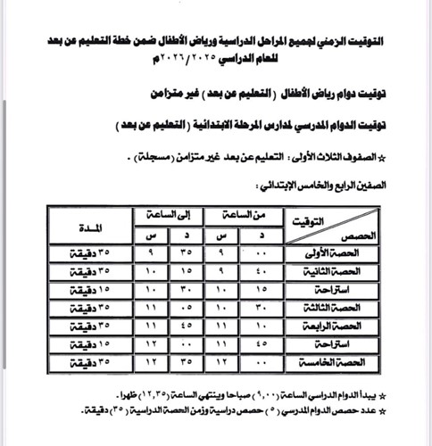 أولا: يتم العمل في مدارس التعليم العام ومدارس التربية الخاصة والتعليم الديني والتعليم الخاص و«المدارس العربية» وفقا لتوقيت الدوام المدرسي (المرفق) لكل مرحلة تعليمية.