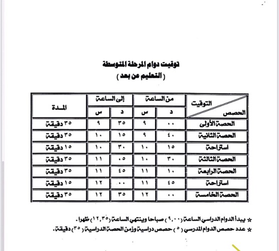 حددت وزارة التربية موعد دوام التعلم عن بعد لكل المراحل التعليمية في التاسعة صباحا في أول يوم دوام بعد عطلة عيد الفطر السعيد على أن يكون خمس حصص يوميا.