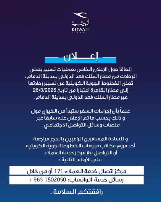 اعتباراً من 26 مارس..”الكويتية” تعلن عن تسيير رحلات إلى مطار القاهرة عبر مطار الملك فهد بالدمام