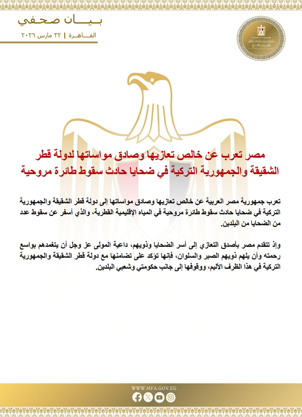 أعربت جمهورية مصر العربية عن خالص تعازيها وصادق مواساتها إلى دولة قطر والجمهورية التركية في ضحايا حادث سقوط طائرة مروحية في المياه الإقليمية القطرية، والذي أسفر عن سقوط عدد من الضحايا من مواطني البلدين.