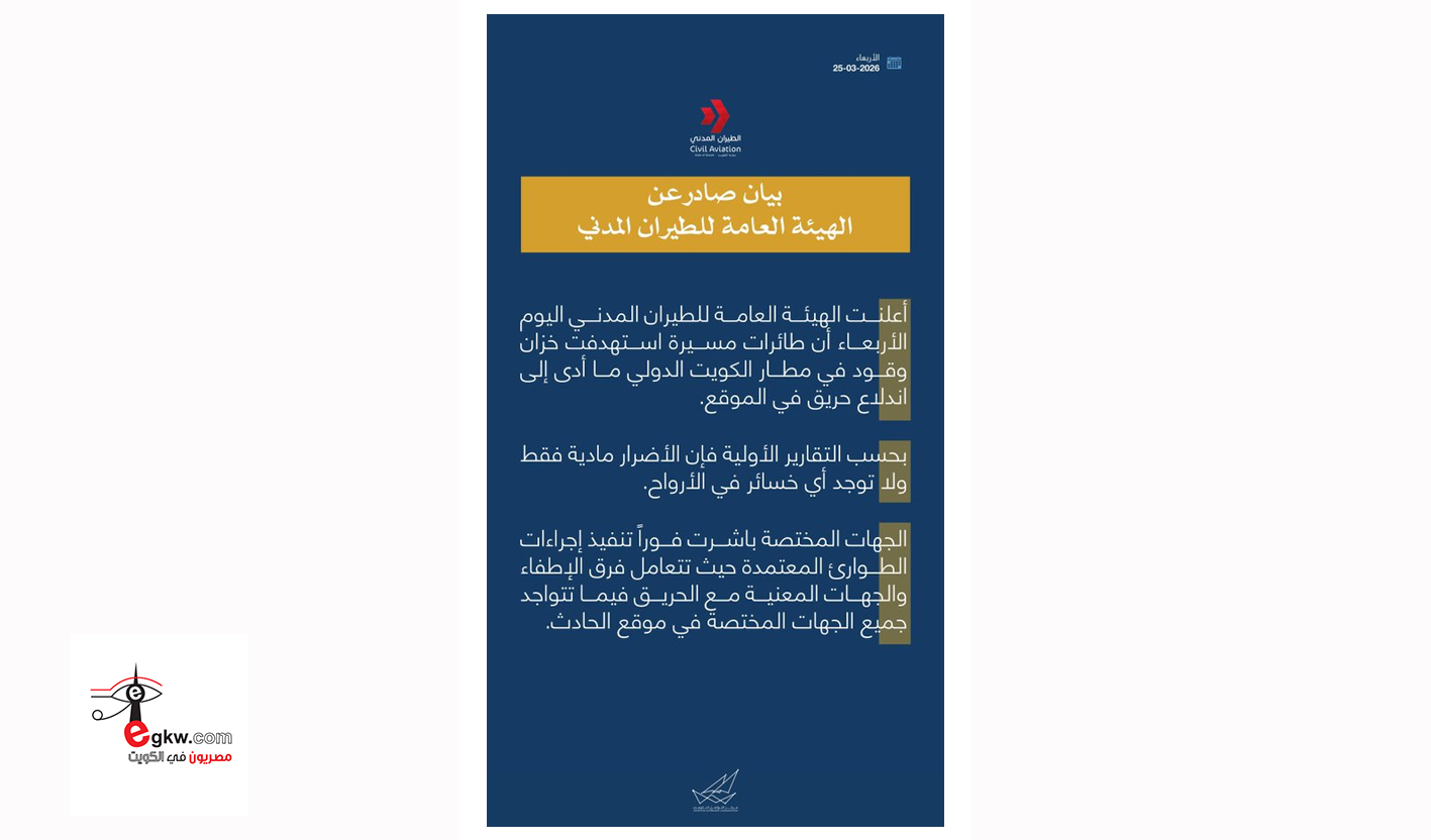 صدر بيان رسمي من الطيران المدني في الكويت عن استهداف خزان وقود في مطار الكويت الدولي بطائرات مسيّرة فجر اليوم الأربعاء، ما أدى إلى اندلاع حريق في الموقع، ووقوع أضرار مادية فقط ،و لا توجد خسائر في الأرواح، وتعاملت فرق الإطفاء مع الحادث فورًا