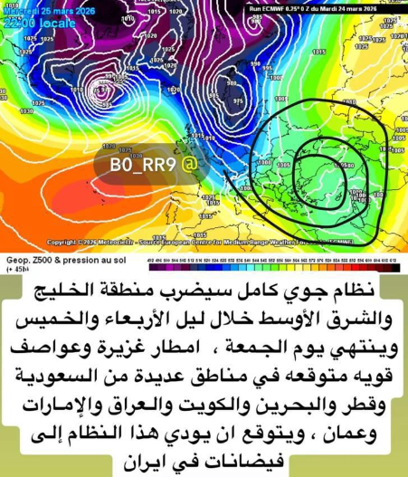 تتعرض منطقة الخليج والشرق الأوسط، خلال ليل الأربعاء والخميس وينتهي الجمعة، نظام جوي كامل من أمطار غزيرة، وعواصف قوية متوقعة في مناطق عديدة من السعودية وقطر والبحرين والكويت والعراق والإماراتـ ويتوقع أن يؤدي هذا النظام إلى فيضانات في إيران