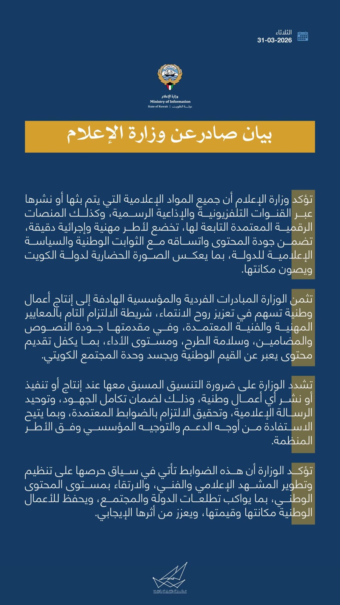 أكدت وزارة الإعلام في دولة الكويت أن جميع المواد الإعلامية التي يتم بثها أو نشرها عبر القنوات التلفزيونية والإذاعية الرسمية، وكذلك المنصات الرقمية المعتمدة، تخضع لأطر مهنية وإجرائية دقيقة، بما يضمن جودة المحتوى واتساقه مع الثوابت الوطنية والسياسة الإعلامية للدولة، ويعكس الصورة الحضارية للكويت ويحفظ مكانتها.