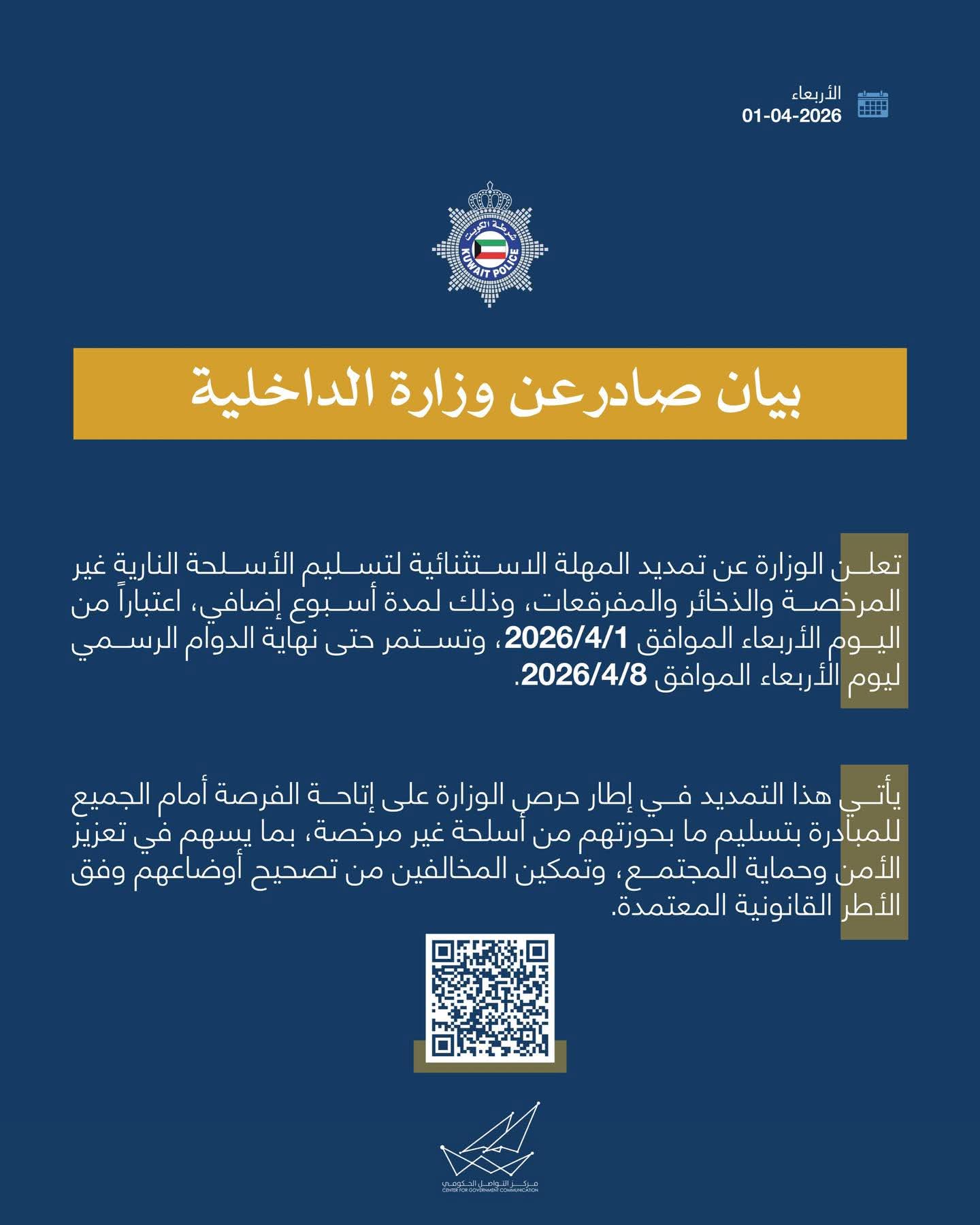 أعلنت وزارة الداخلية الكويتية تمديد المهلة الاستثنائية لتسليم الأسلحة النارية غير المرخصة والذخائر والمفرقعات، لمدة أسبوع إضافي، تبدأ اعتبارًا من اليوم الأربعاء الموافق 1 أبريل 2026، وتستمر حتى نهاية الدوام الرسمي ليوم الأربعاء 8 أبريل 2026.