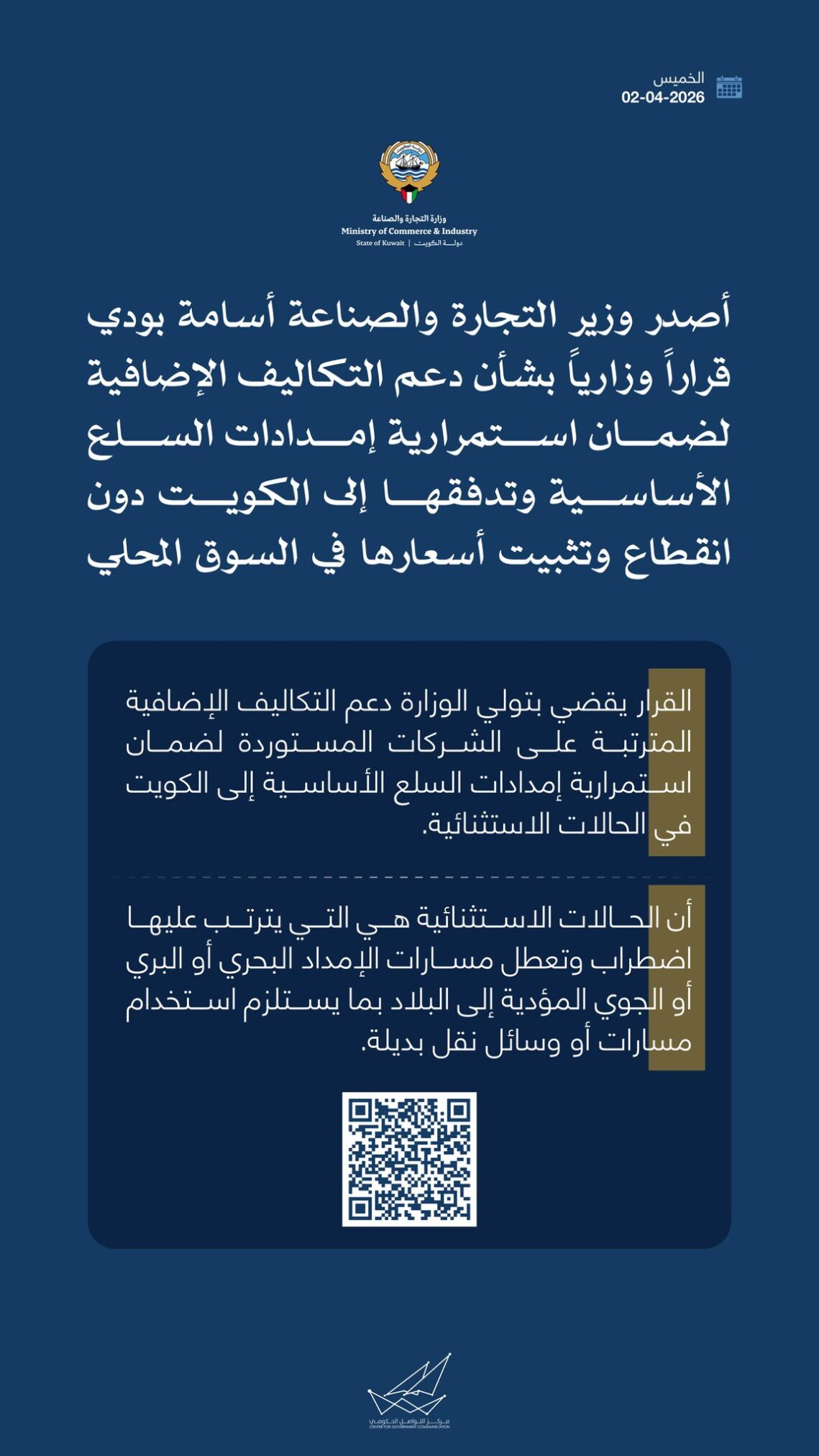 أصدر وزير التجارة والصناعة بالكويت أسامة بودي قراراً وزارياً بشأن دعم التكاليف الإضافية لضمان استمرارية إمدادات السلع الأساسية وتدفقها إلى الكويت دون انقطاع وتثبيت أسعارها في السوق المحلي