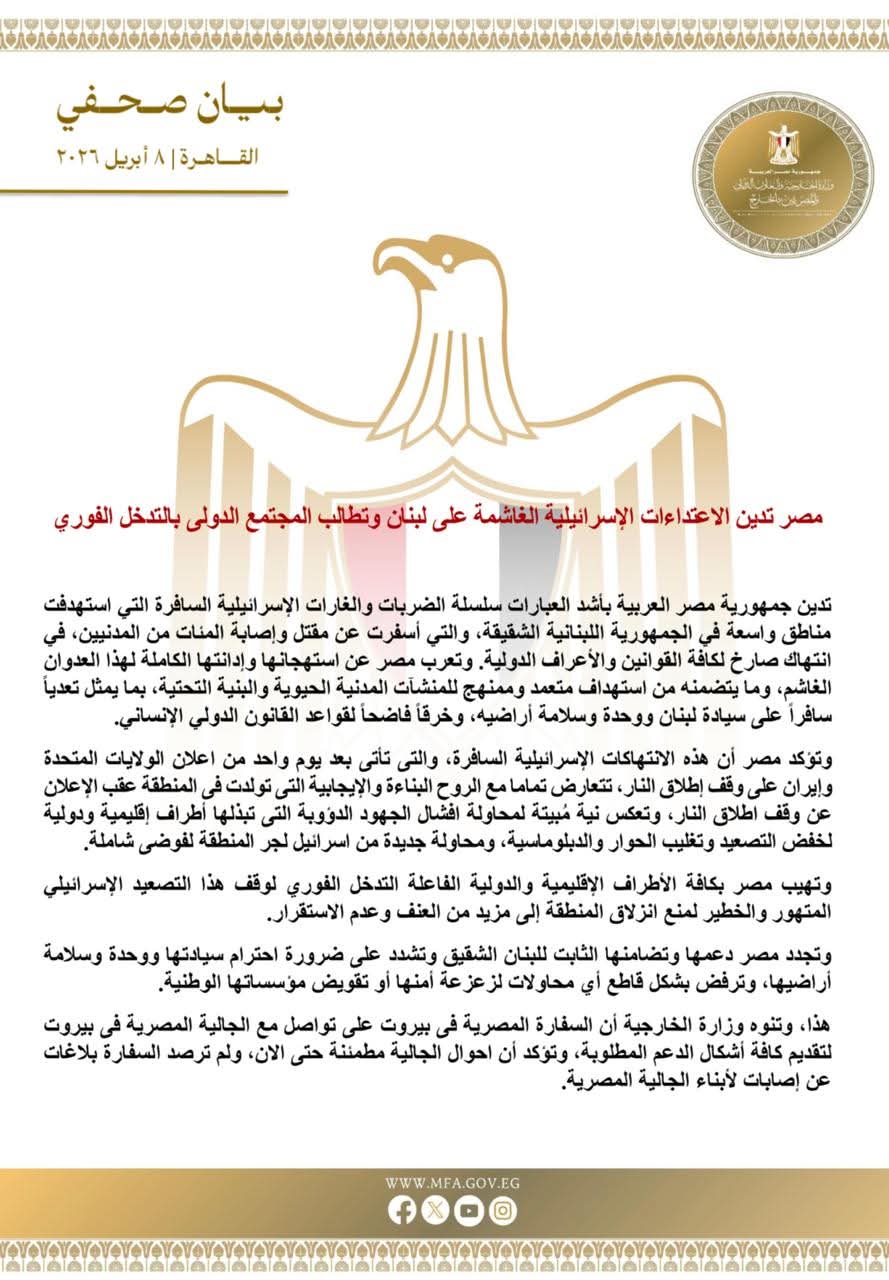 كما جددت القاهرة دعمها الكامل للبنان، مؤكدة تضامنها مع الشعب اللبناني، وحرصها على وحدة وسلامة أراضيه، ورفضها لأي محاولات تستهدف زعزعة استقراره أو تقويض مؤسساته الوطنية.