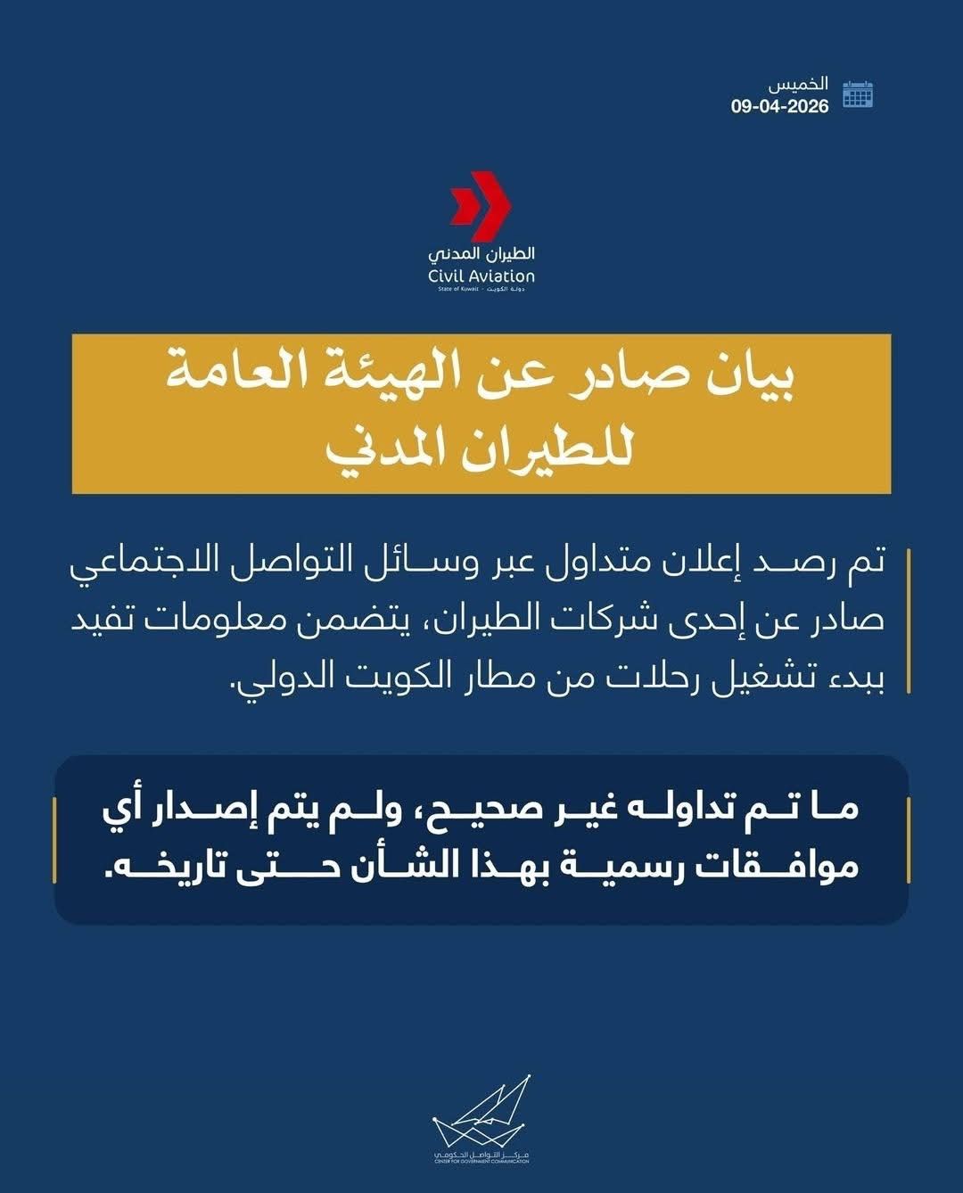 أعلنت الهيئة العامة للطيران المدني بالكويت أنه تم رصد إعلان متداول عبر وسائل التواصل الاجتماعي صادر من إحدى شركات الطيران يتضمن معلومات تفيد ببدء تشغيل رحلات طيران من مطار الكويت الدولي