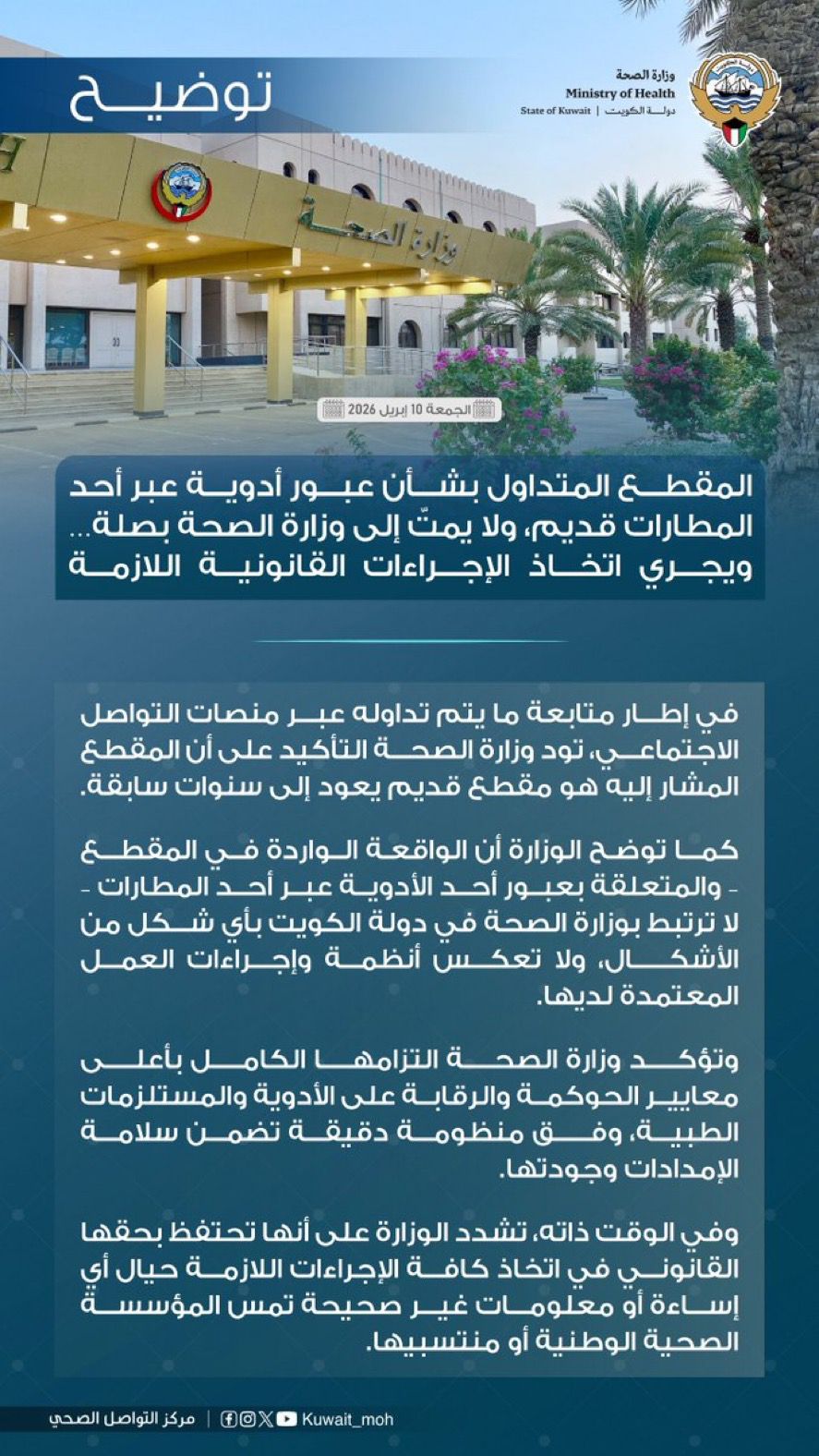 وقالت وزارة الصحة في توضيحها: “في إطار متابعة ما يتم تداوله عبر منصات التواصل الاجتماعي، أكدت وزارة الصحة أن المقطع المتداول بشأن عبور أدوية عبر أحد المطارات هو مقطع قديم يعود إلى سنوات سابقة.