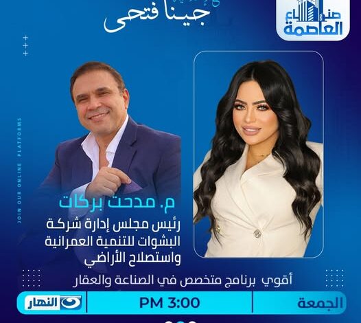 يلتقي المهندس مدحت بركات رئيس مجلس إدارة شركة البشوات للتنمية العمرانية واستصلاح الأراضي، اليوم الجمعة الساعة 3 عصرًا على قناة النهار ، في برنامج “صنّاع العاصمة” مع الإعلامية جينا فتحي