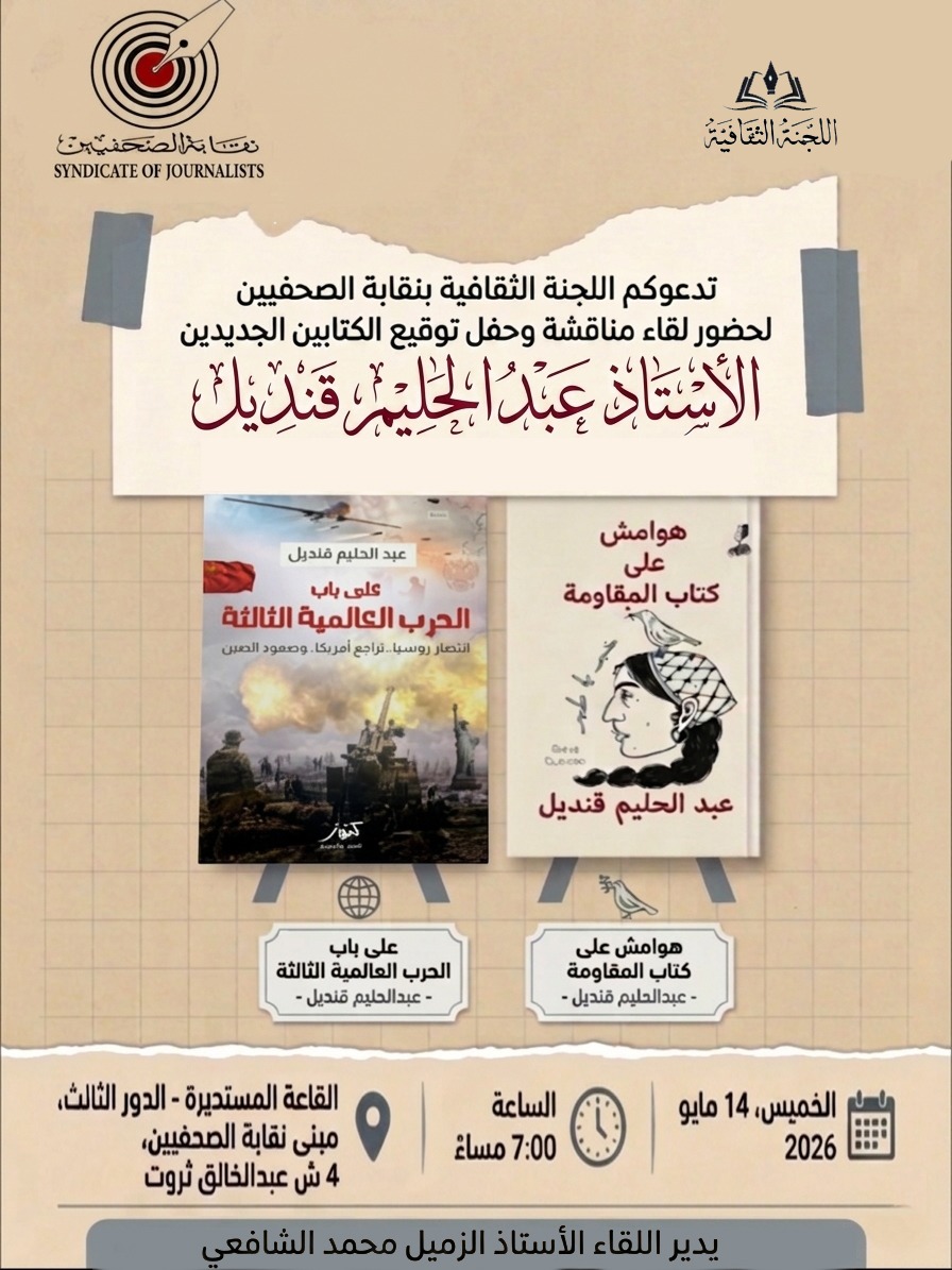 تستضيف اللجنة الثقافية بنقابة الصحفيين لقاءً لمناقشة وتوقيع أحدث إصدارات الكاتب الصحفي عبدالحليم قنديل، بعنواني «على باب الحرب العالمية الثالثة» و«هوامش على كتاب المقاومة»، وذلك في إطار الفعاليات الثقافية التي تنظمها النقابة.