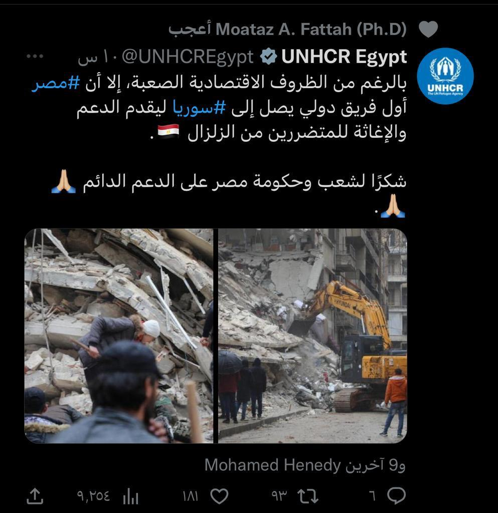 وأضاف الشبلي إن الدفاع المدني السوري تقدم بالشكر والتقدير للشعب المصري بناء على جهود الفريق التقني الوحيد الذي دخل إلى مناطق صعبة متضررة بشكل كبير جدا بسبب آثار الزلزال المدمر والذي أسقط آلاف الضحايا حتى الآن .