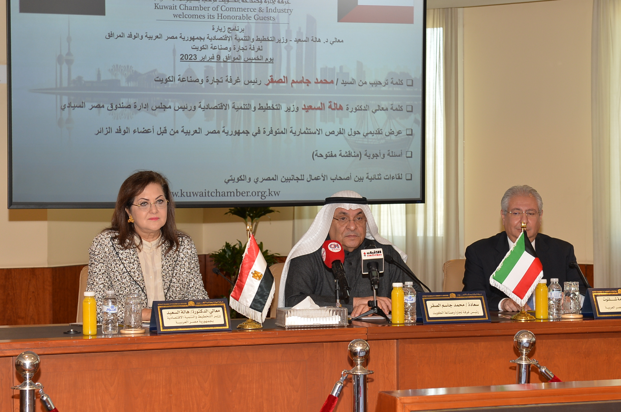 استقبلت غرفة تجارة وصناعة الكويت، يوم الخميس 9 فبراير 2023، وفدا اقتصاديا مصريا برئاسة معالي وزيرة التخطيط والتنمية الاقتصادية ورئيسة مجلس إدارة صندوق مصر السيادي الدكتورة هالة السعيد وعدد من مسؤولي الصندوق السيادي المصري، وقد ترأس الجانب الكويتي السيد محمد جاسم الصقر رئيس غرفة تجارة وصناعة الكويت، وبحضور سعادة السفير المصري لدى الكويت السيد أسامة شلتوت، وعدد من أعضاء مجلس إدارة الغرفة، ومستثمرين من القطاع الخاص، وتأتي هذه الزيارة بعد تنسيق مسبق مع الجهات الرسمية المختصة، حيث قام الوفد الزائر بعقد لقاءات أخرى مع عدد من الجهات.