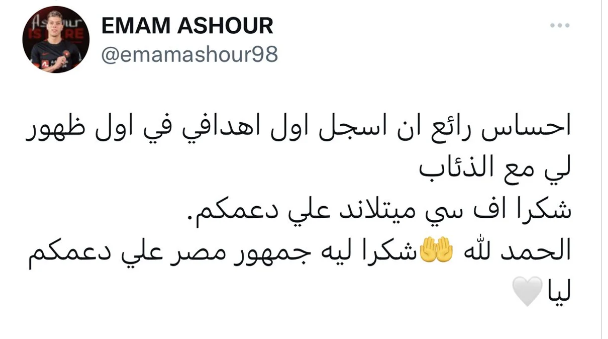 وكتب إمام عاشور: “إحساس رائع ان اسجل اول اهدافي في اول ظهور لي مع الذئاب.. شكرا اف سي ميتلاند علي دعمكم.. الحمد لله شكرا ليه جمهور مصر علي دعمكم ليا”.