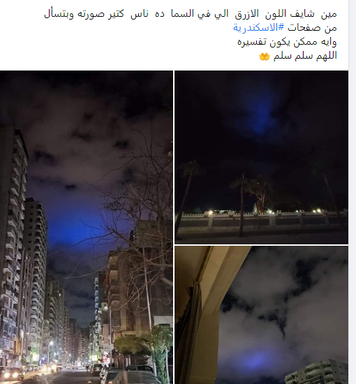 تداول رواد مواقع التواصل الاجتماعي ، صورا لـ سماء مدينة الإسكندرية يظهر فيها ضوء أزرق في الأسكندرية غريب، ويؤكدون أن ذلك الضوء في السماء ظهر مع حدوث زلزال تركيا وأنه ربما ينبأ بحدوث زلزال جديد مدمر، ويشعر عدد كبير من المواطنين بخوف كبير بسبب ذلك الضوء الذي يجهلون مصدره.