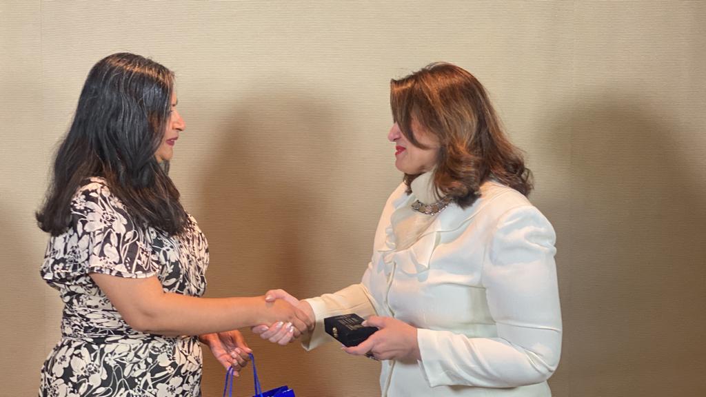 وفي ختام اللقاء، أهدت السفيرة سها جندي درع وزارة الهجرة للسيدة فرح خان عمدة مدينة ايرفين، كما تبادلتا الهدايا التذكارية.
