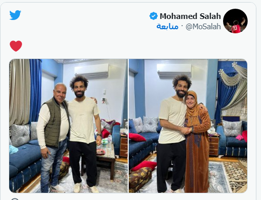 ونشر صلاح الثلاثاء، صورة له مع والدته، داخل منزل في مصر، قد يكون منزل العائلة، كما نشر صورة لوالده، ووضع رسما تعبيريا وهو “القلب”.