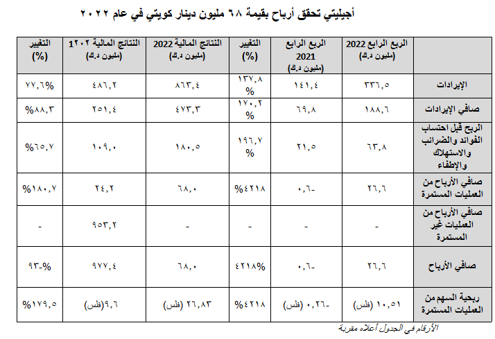 شركة أجيليتي تعلن عن تحقيق أرباح بقيمة 68 مليون دينار كويتي في عام 2022