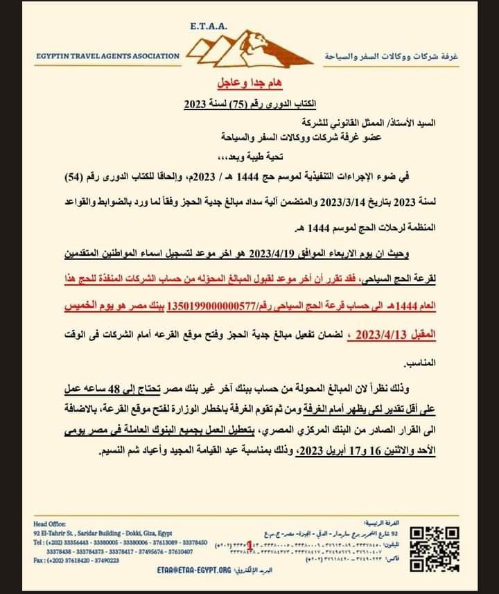 وقالت الغرفة في منشور رسمي، تم تعميمه على جميع شركات السياحة العاملة في الموسم، وحصل “مصراوي” على نسخة منه اليوم الثلاثاء، إن غداً الأربعاء 12 أبريل، هو آخر موعد لتسجيل أسماء المواطنين المتقدمين لقرعة الحج السياحي.