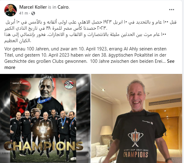 وكتب كولر عبر حسابه على فيس بوك: “قبل ١٠٠ عام وبالتحديد في ١٠ ابريل ١٩٢٣ حصل الأهلي على أول ألقابه و بالأمس في ١٠ أبريل ٢٠٢٣ حصدنا كأس مصر للمرة ٣٨ في تاريخ النادي الكبير”.