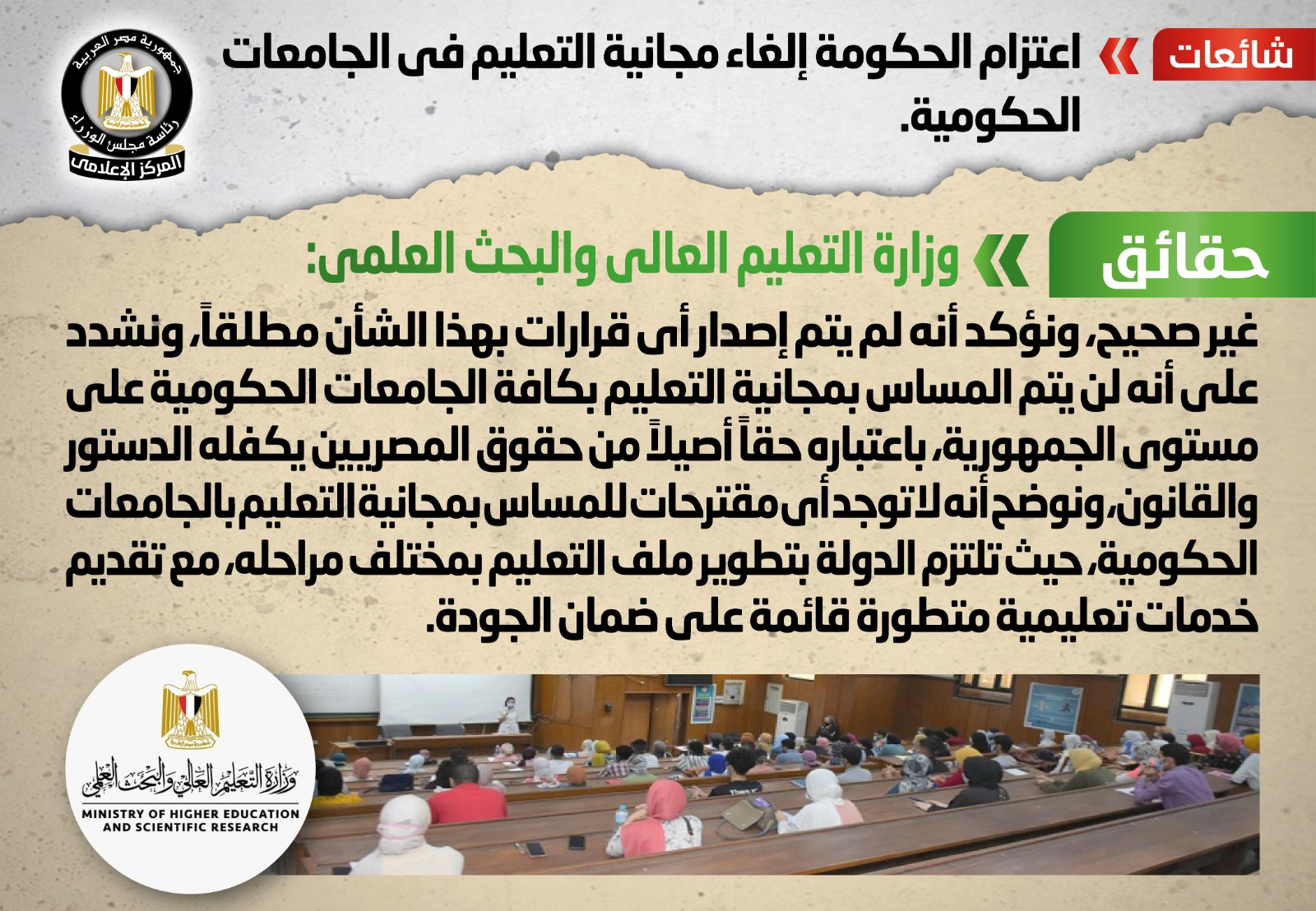 كشف المركز الإعلامي لمجلس الوزراء، أنه فى ضوء ما تردد من أنباء بشأن اعتزام الحكومة إلغاء مجانية التعليم في الجامعات الحكومية. ، تواصل المركز مع وزارة التعليم العالي والبحث العلمي، والتي نفت تلك الأنباء تماماً. ، مُؤكدةً أنه لا صحة لإلغاء مجانية التعليم في الجامعات الحكومية، وأنه لم يتم إصدار أي قرارات بهذا الشأن مطلقاً.