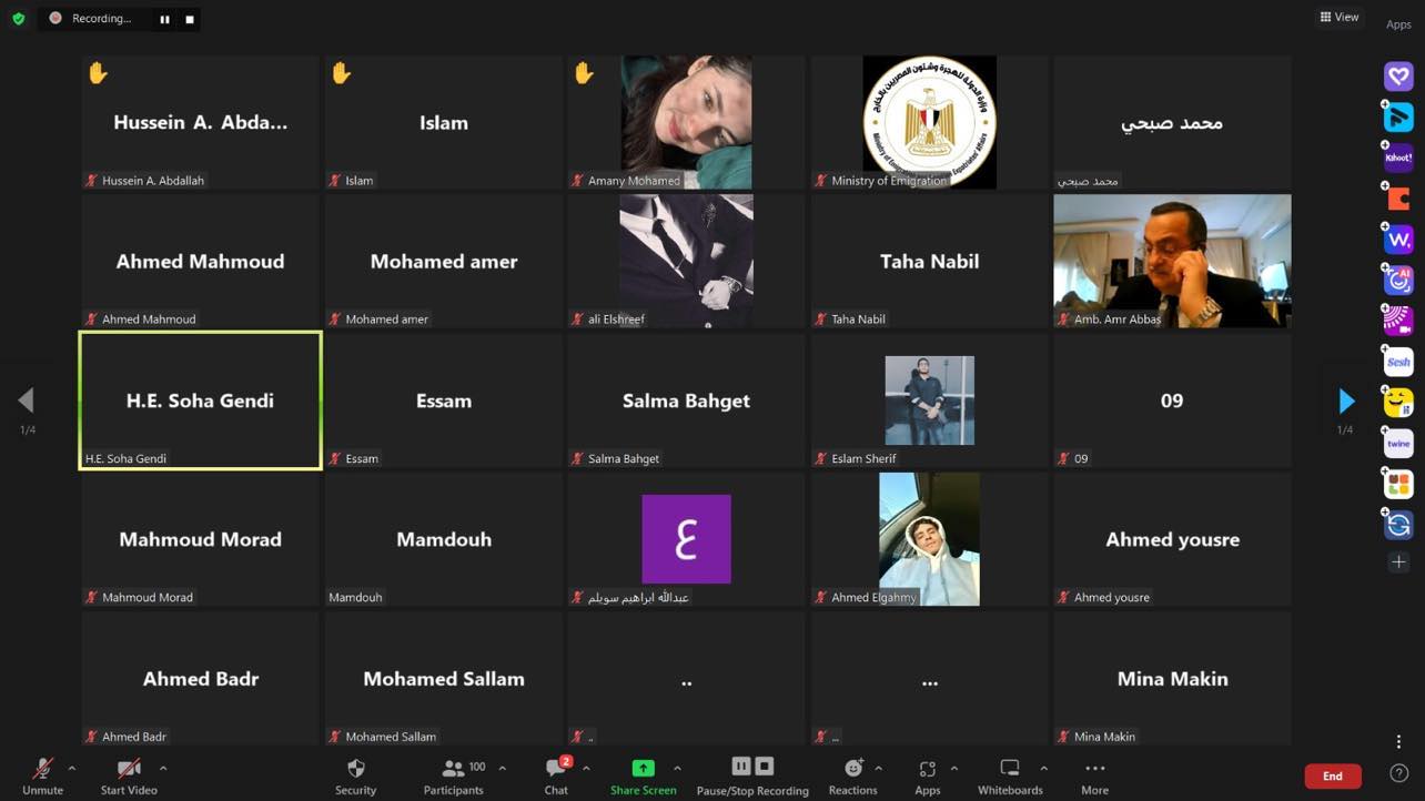 عقدت السفيرة سها جندي، وزيرة الدولة للهجرة وشئون المصريين بالخارج. ، لقاء افتراضيًا عبر “الفيديوكونفرانس” مع ١٠٠ من الطلبة المصريين بالسودان وعدد من أولياء الأمور. ، للاستماع إليهم والاطمئنان على أوضاعهم، في ظل حالة الاضطراب التي يعشيها البلد الشقيق، وذلك في إطار متابعة وزارة الهجرة المستمرة. على مدار الساعة لوضع الجالية المصرية والموقف هناك، بحضور السفير عمرو عباس مساعد وزيرة الهجرة لشئون الجاليات.