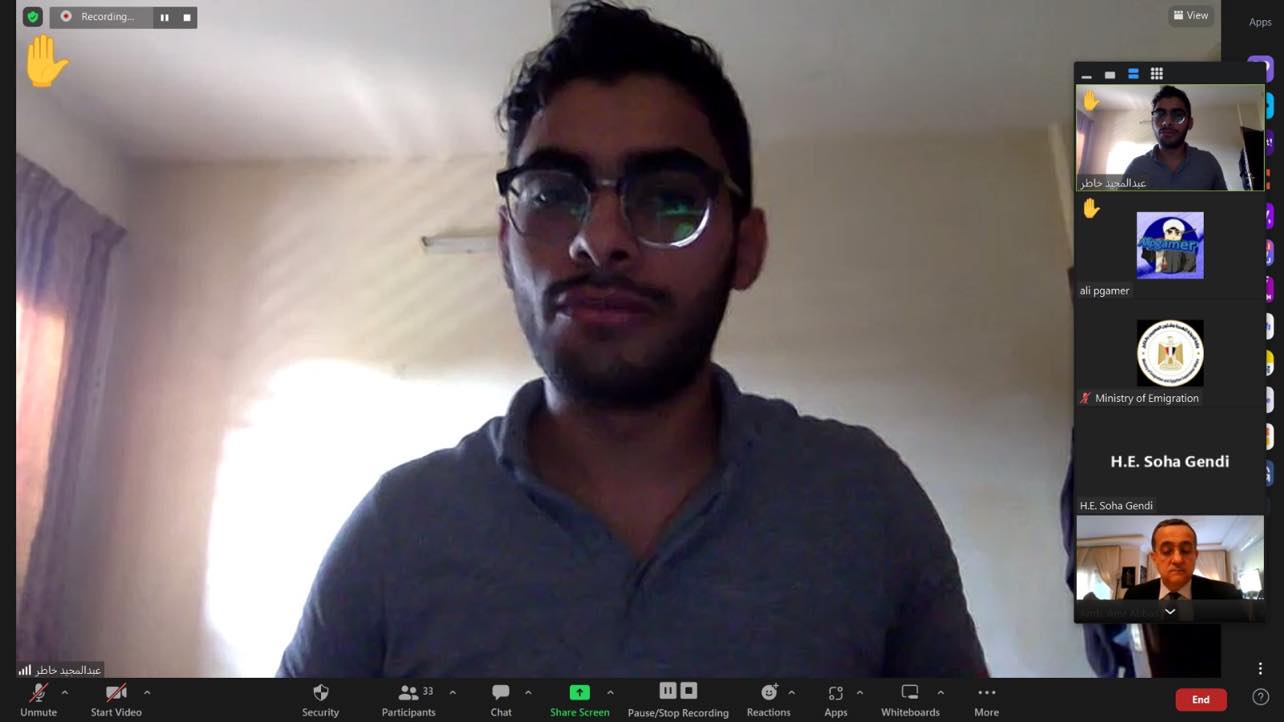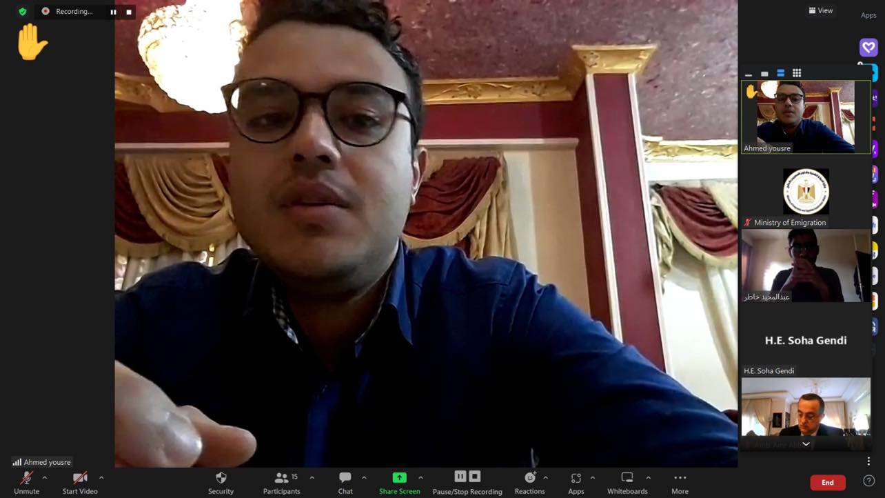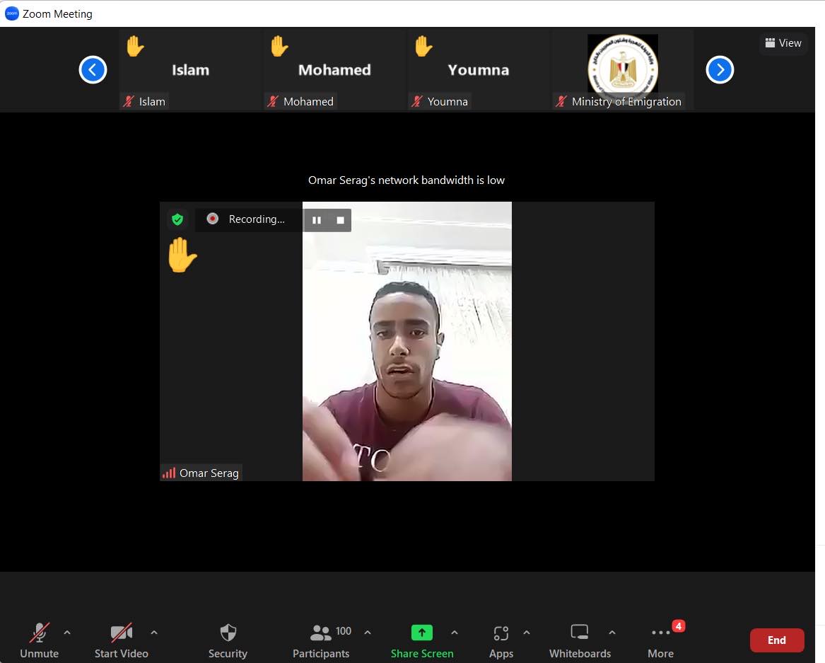 وخلال اللقاء، قال أحمد يسري، ممثل مركز وزارة الهجرة لشباب المصريين بالخارج بالسودان. ، إن عدد الطلاب المصريين في السودان أقل من العدد الفعلي، حيث إن عددا كبيرا من الطلاب متواجدين بمصر. ، نظرًا لأن شهر رمضان في السودان يعد إجازة رسمية في كثير من الجامعات وأغلب الطلاب المصريين غادروا لقضاء الإجازة بمصر. ، والباقيين في السودان انتظارًا لاختبارات عقب العيد، موضحًا أن عدد من قام بالتسجيل في الاستمارة الالكترونية. حتى الآن وصل لنحو أكثر من 400 طالب وأنه تواصل مع العديد من الطلاب لملء الاستمارة لتيسير التواصل معهم.