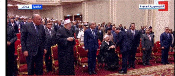 الرئيس السيسي يصافح أحمد عمر هاشم خلال احتفالية ليلة القدر -صورة