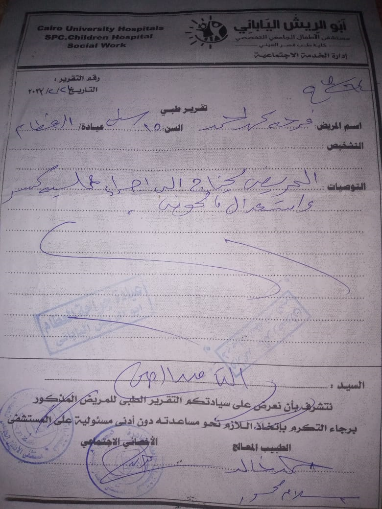 أرسل المواطن المصري محمد أحمد عبدالرحمن بسيوني مناشدة لأهل الخير في شهر الخير عبر موقع (أوجات – مصريون www.q8eg.com) يطلب كرسي متحرك لأبنته الطفلة والتي تعاني من عجز تام يعيقها عن الحركة منذ ولادتها.