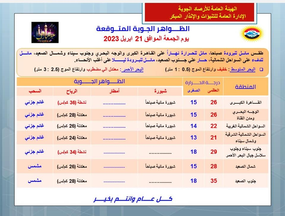 أعلنت الهيئة العامة للأرصاد الجوية حالة الطقس المتوقعة اليوم الجمعة، أول أيام عيد الفطر المبارك.