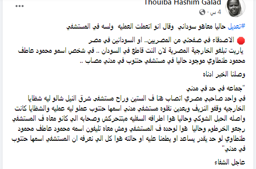وناشدت الناشطة السودانية ثويبة هاشم وزارة الخارجية المصرية بحالة الشاب المصاب، للتحرك من أجل مساعدته.