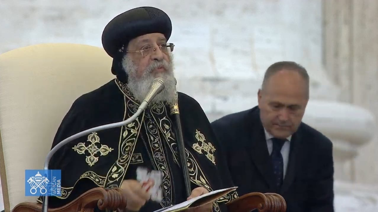 وبينما تواجد في الساحة عشرات الألوف من المتابعين، رغم سقوط أمطار والحالة غير المستقرة الطقس وهو المعتاد في مثل هذا الوقت من السنة في الڤاتيكان، وسادت حالة من الفرح لدى الحضور، ورتلت بعض الألحان القبطية قبل بدء كلمة قداسة البابا تواضروس، الذي افتتح كلمته بأن قال بسم الآب والابن والروح القدس باللغة القبطية، ثم هنأ قداسة البابا فرنسيس بمناسبة ذكرى اختياره للكرسي البابوي، معربًا عن تقديره للجهود التي يبذلها بابا الڤاتيكان في مجالاتٍ عدة. وأكد قداسته أن يوم المحبة الأخوية يجسد الروح المسيحية والمحبة التي تجمعنا في خدمة الله.