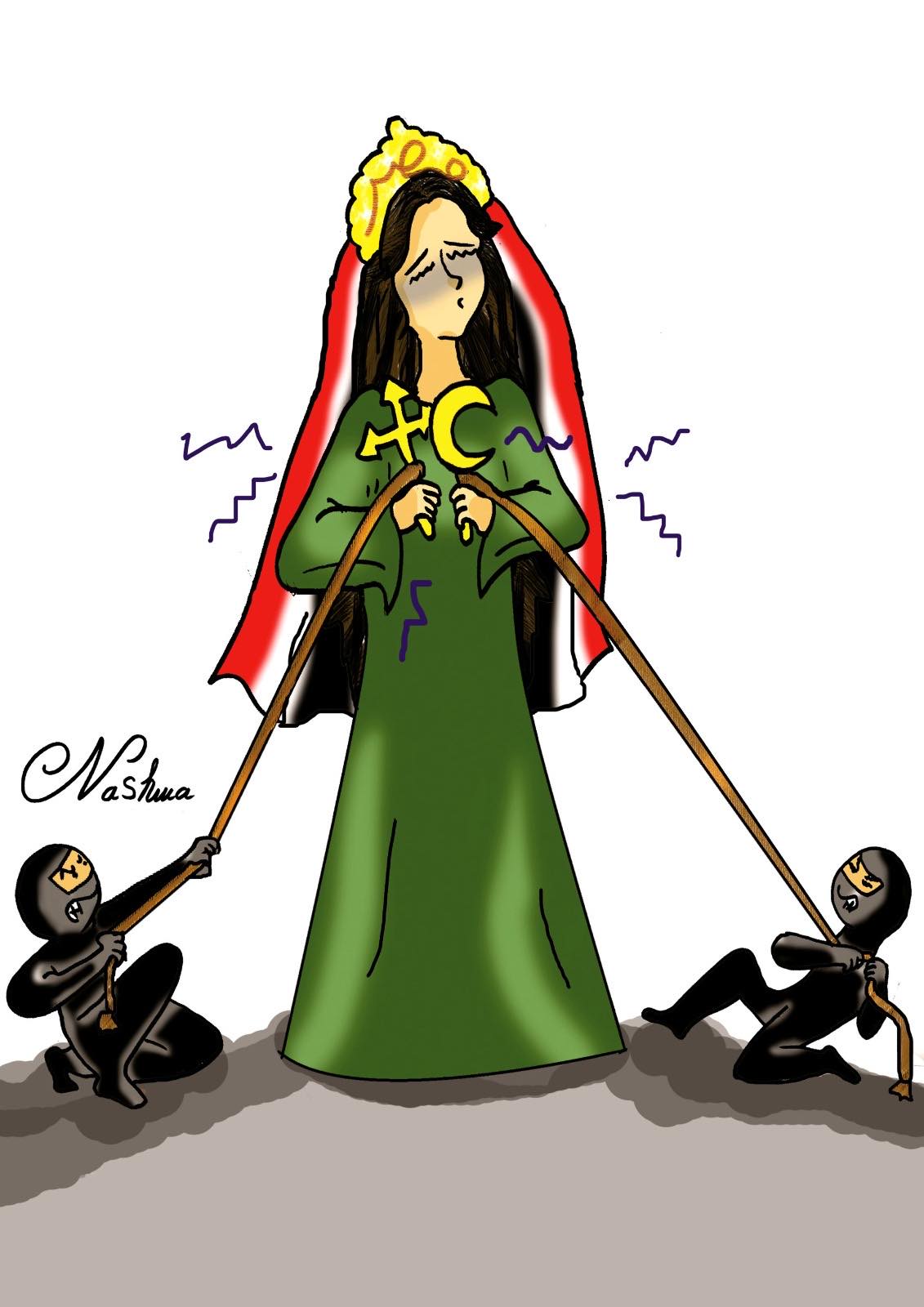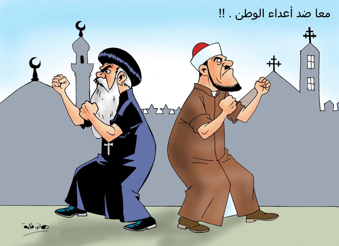 ولفت جمعة إلى أن الكاريكاتيرات جاءت بأفكار جميلة تعضد الوحدة الوطنية وتظهر مدى التماسك في مواجهة أعداء الداخل والخارج من خلال استخدام رمزي الهلال والصليب وتوظيفهما في أشكال جمالية بديعة.