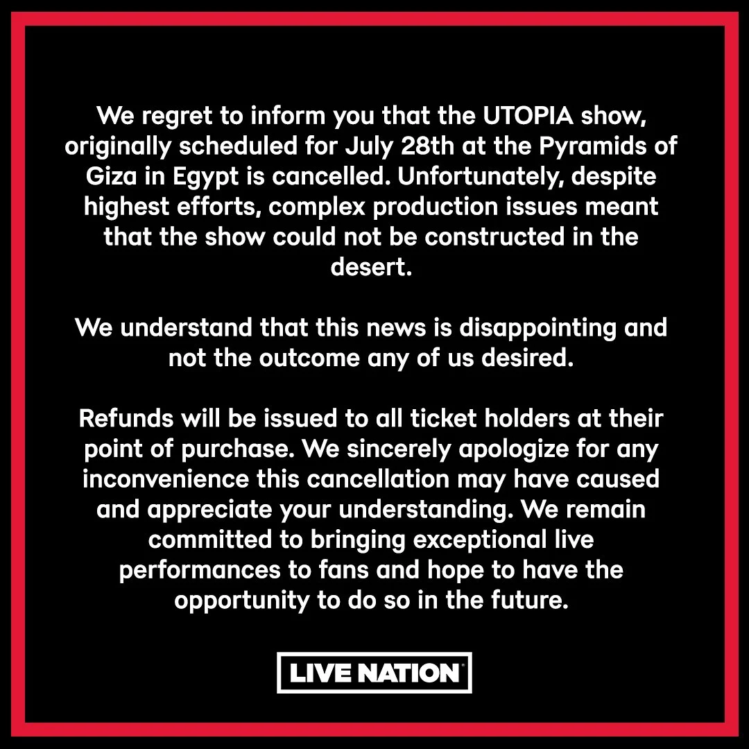 وكتبت اشركة عبر تويتر: تم إلغاء العرض، الذي كان مقررا أصلا في 28 يوليو في أهرامات الجيزة في مصر. لسوء الحظ، على الرغم من الجهود الجبارة، أدت مشاكل الإنتاج المعقدة إلى عدم إمكانية إقامة المعرض في الصحراء.