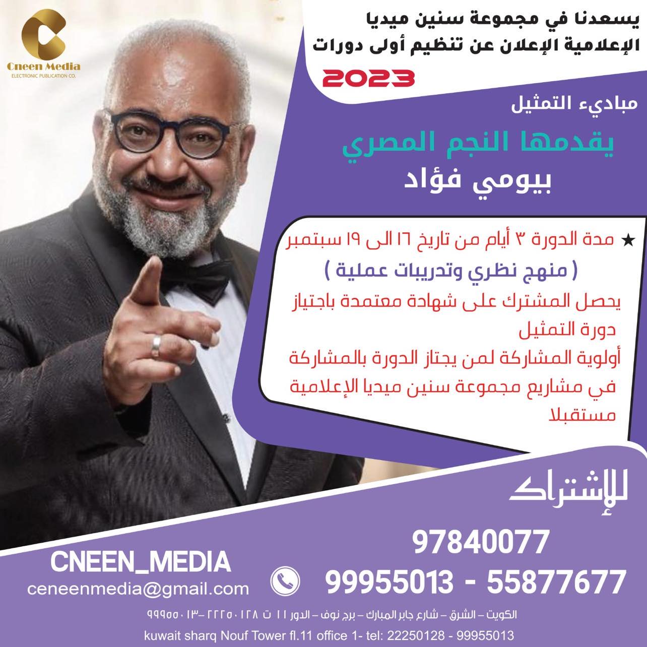 الكويت.. مجموعة سنين ميديا الإعلامية تعلن عن تنظيم دورة “مباديء التمثيل” تقديم الفنان بيومي فؤاد