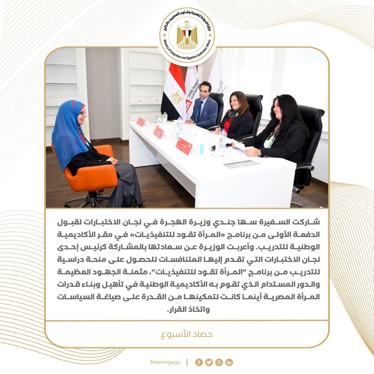 3) شاركت السفيرة سها جندي وزيرة الهجرة في لجان الاختبارات لقبول الدفعة الأولى من برنامج «المرأة تقود للتنفيذيات» في مقر الأكاديمية الوطنية للتدريب. وأعربت الوزيرة عن سعادتها بالمشاركة كرئيس إحدى لجان الاختبارات التي تقدم إليها المتنافسات للحصول على منحة دراسية للتدريب من برنامج “المرأة تقود للتنفيذيات”، مثمنة الجهود العظيمة والدور المستدام الذي تقوم به الأكاديمية الوطنية في تأهيل وبناء قدرات المرأة المصرية أينما كانت لتمكينها من القدرة على صياغة السياسات واتخاذ القرار.