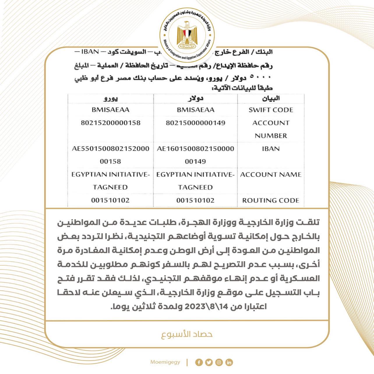 7) تلقت وزارة الخارجية ووزارة الهجرة، طلبات عديدة من المواطنين بالخارج حول إمكانية تسوية أوضاعهم التجنيدية، نظرا لتردد بعض المواطنين من العودة إلى أرض الوطن وعدم إمكانية المغادرة مرة أخرى، بسبب عدم التصريح لهم بالسفر كونهم مطلوبين للخدمة العسكرية أو عدم إنهاء موقفهم التجنيدي، لذلك فقد تقرر فتح باب التسجيل على موقع وزارة الخارجية، الذي سيعلن عنه لاحقا اعتبارا من 14\8\2023 ولمدة ثلاثين يوما.