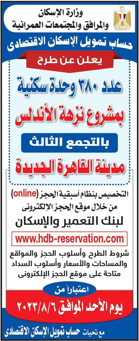 وكشف بيان حساب تمويل الإسكان الاقتصادي، أن التخصيص بنظام أسبقية الحجز “online” من خلال موقع الحجز الإلكتروني لبنك التعمير والإسكان.