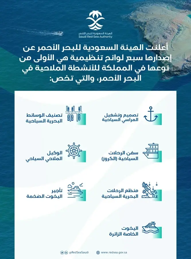 أعلنت الهيئة السعودية للبحر الأحمر، عن إصدارها سبع لوائح تنظيمية للأنشطة الملاحية في البحر الأحمر، والتي تخص تصميم وتشغيل المراسي السياحية، وتصنيف الوسائط البحرية السياحية، وسفن الرحلات السياحية (الكروز).