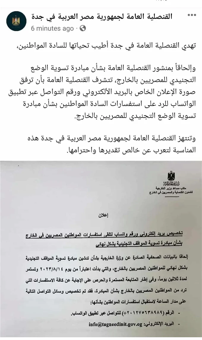 وأفاد بيان قنصلية مصر في جدة الذي نص على: “إلحاقاً بمنشور القنصلية العامة، بشأن مبادرة تسوية الوضع التجنيدي للمصريين بالخارج، تتشرف القنصلية العامة بأن ترفق صورة الإعلان الخاص بالبريد الإلكتروني ورقم التواصل عبر تطبيق الواتساب للرد على استفسارات السادة المواطنين بشأن مبادرة تسوية الوضع التجنيدي للمصريين بالخارج”.