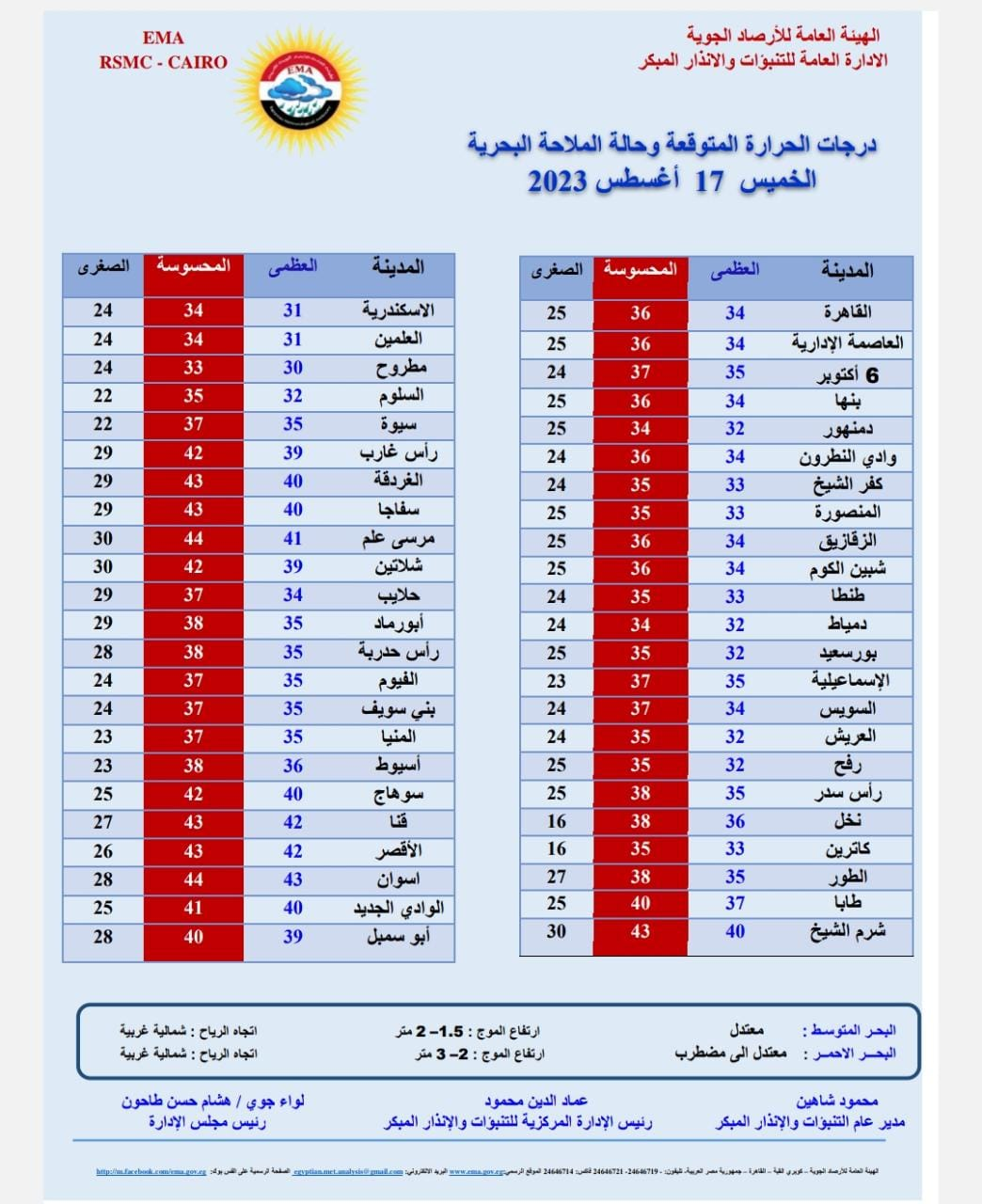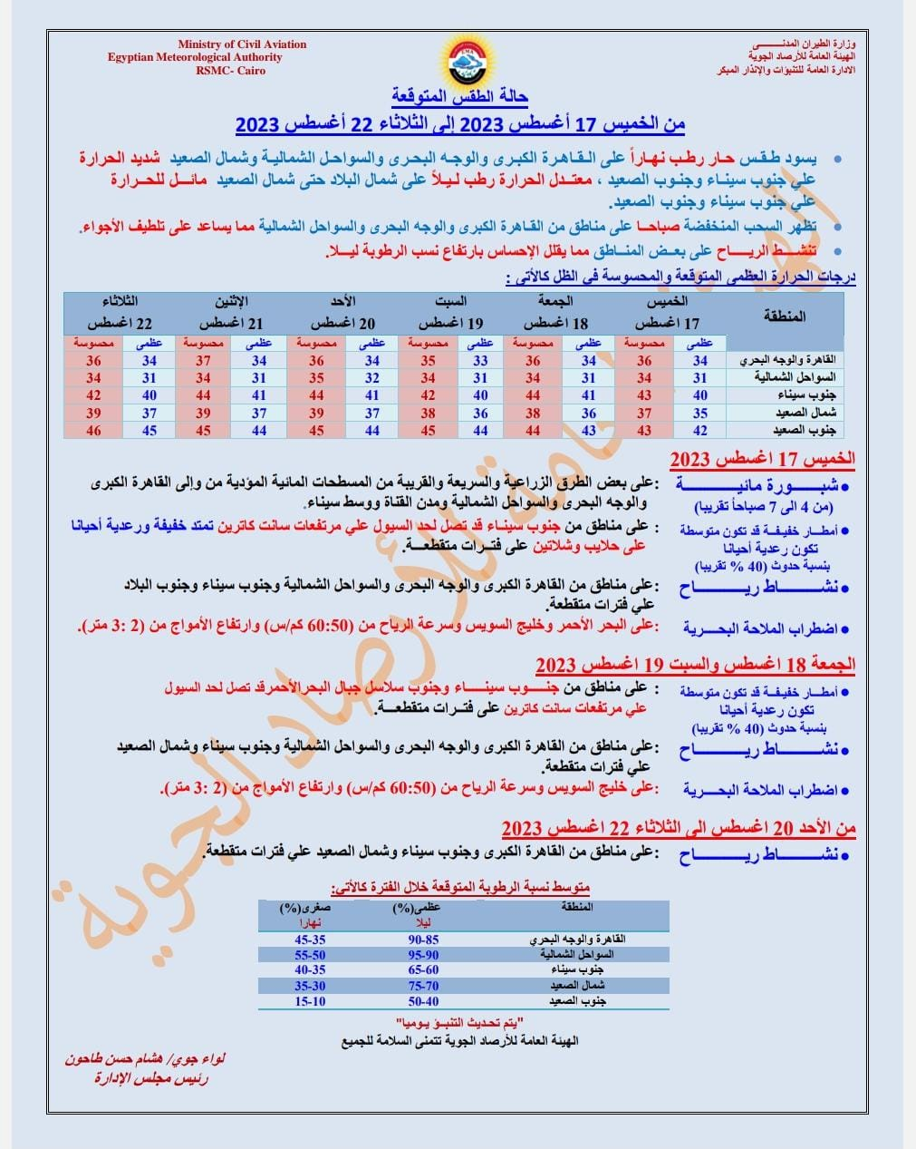 كشفت الأرصاد الجوية حالة الطقس المتوقعة على كافة الأنحاء من الخميس 17 أغسطس إلى الثلاثاء 22 أغسطس وخريطة التقلبات الجوية، لتتوقع الأرصاد الجوية أن يسود طقس حار رطب نهارا على القاهرة الكبرى والوجه البحري وعلى السواحل الشمالية وشمال الصعيد، وشديد الحرارة على جنوب سيناء وجنوب الصعيد أما عن حالة الطقس ليلا توقعت الأرصاد الجوية أن يكون الطقس معتدل الحرارة رطب على شمال البلاد حتى شمال الصعيد، ومائل للحرارة على جنوب سيناء وجنوب الصعيد.
