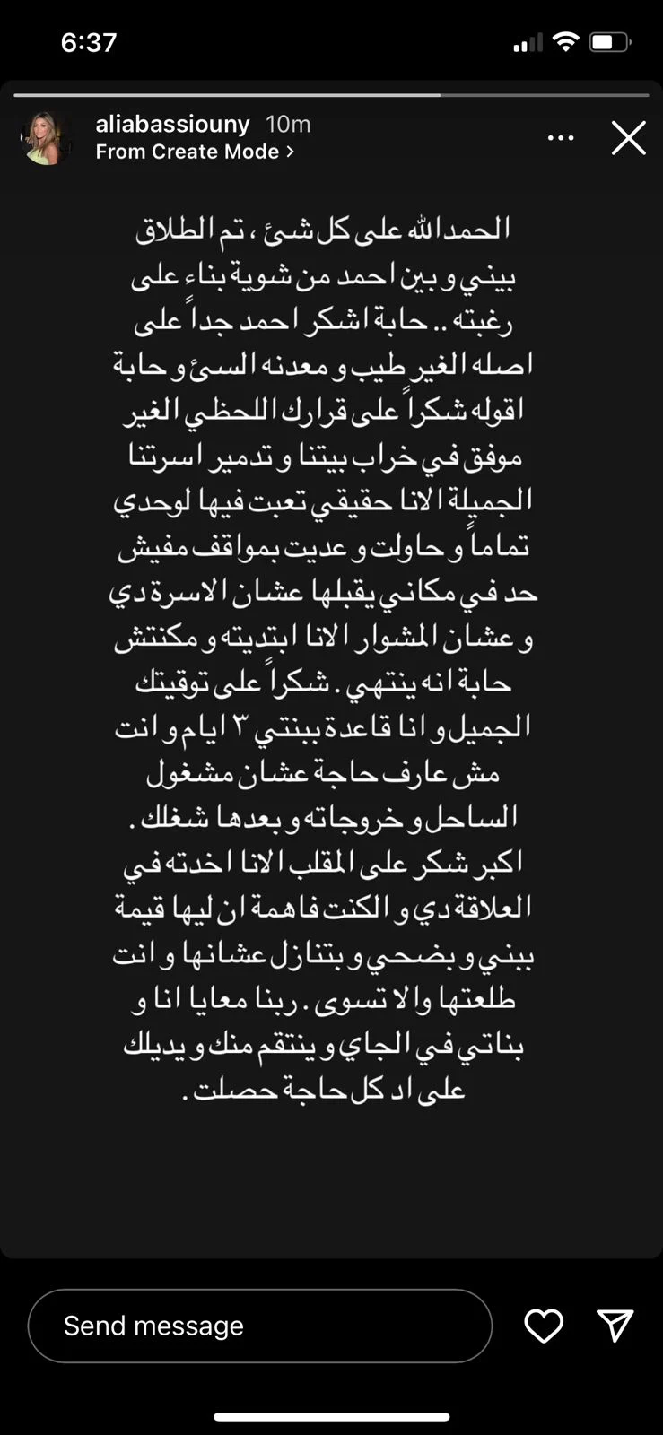 وكتبت علياء بسيوني عبر انستجرام:” الحمد لله على كل شيء .. تم الطلاق بيني وبين أحمد من شوية بناء على رغبته.. حابة أشكر أحمد جدا على أصله الغير طيب ومعدنه السيء .. وحابة أقوله شكرا على قرارك اللحظي الغير موفق في خراب بيتنا وتدمير أسرتنا”.