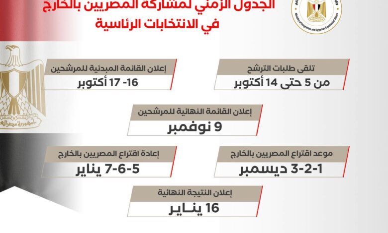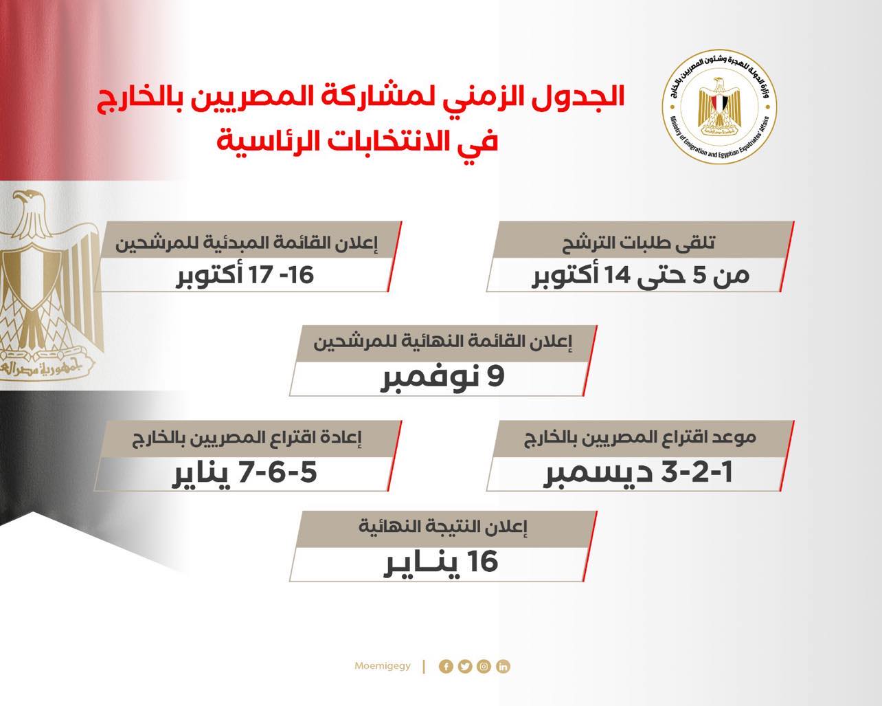 وتضمن الجدول الزمني إجراءات انتخابات الرئاسة، بحسب ما أعلنه المستشار وليد حمزة في المؤتمر الصحفي، 3 أيام للاقتراع المصريين بالخارج على أن يبدأ التصويت من 9 صباحا وحتى 9 مساء بتوقيت كل دولة أيام 1 و2 و3 ديسمبر، وتبدأ انتخابات الإعادة للمصريين في الخارج أيام 5 و6 و7 يناير.