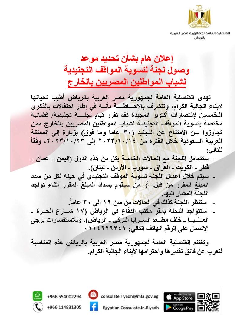 اعلنت القنصلية المصرية في الرياض عن موعد وصول لجنة لتسوية المواقف التجنيدية لشباب المواطنين المصريين بالخارج .