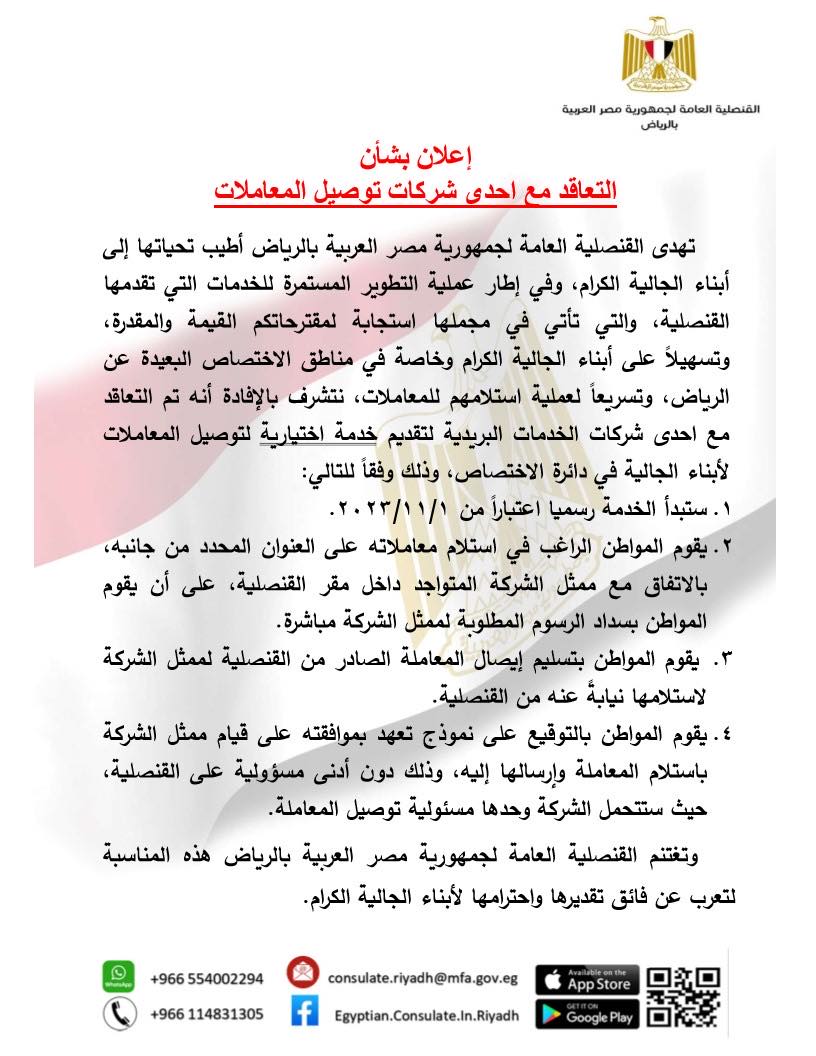 أعلنت القنصلية العامة لجمهورية مصر العربية في الرياض عنه تسهيلا على أبناء الجالية الكرام وخاصة في مناطق الاختصاص البعيدة عن الرياض، وتسريعا لعملية استلامهم للمعاملات، تم التعاقد مع إحدى الشركات البريدية لتقديم خدمة اختيارية لتوصيل المعاملات لأبناء الجالية في دائرة الاختصاص وفقا للاتي