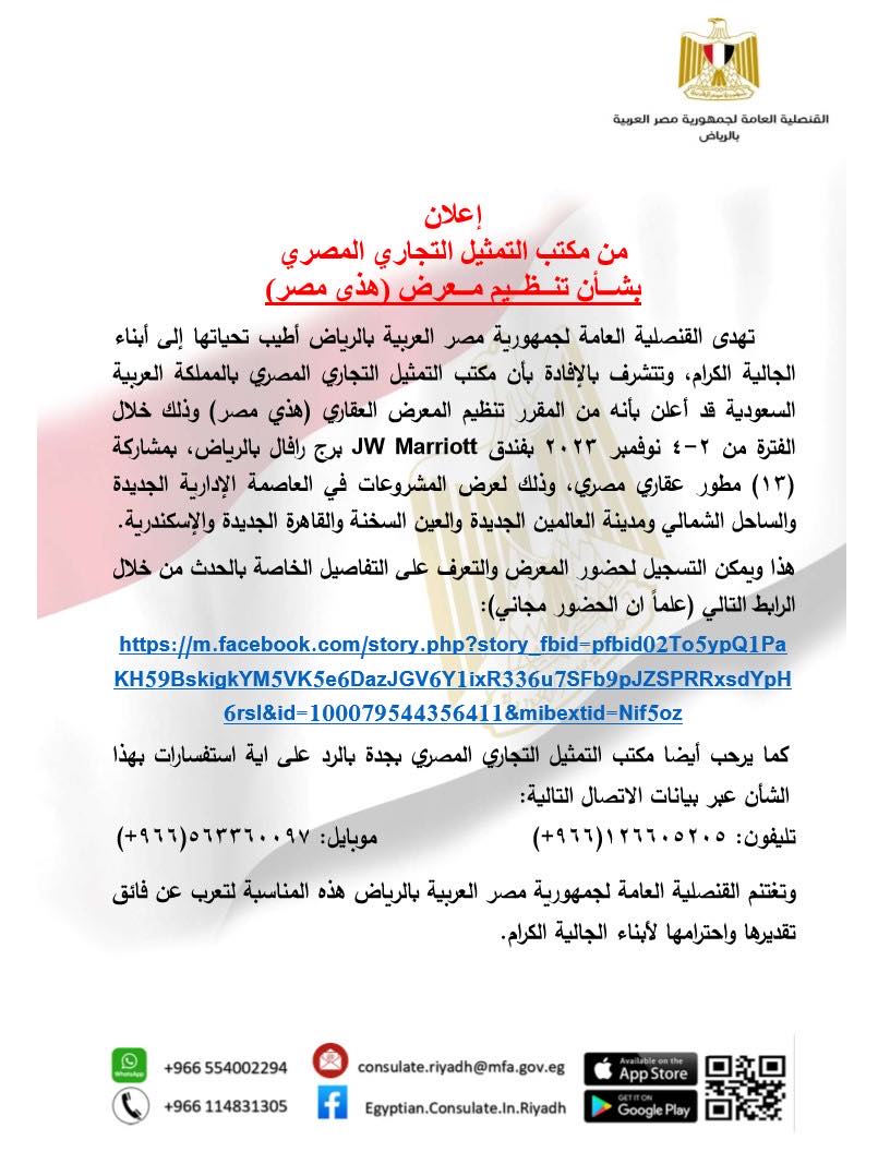 قنصلية مصر بالرياض تعلن عن تنظيم المعرض العقاري (هذي مصر) بالسعودية
