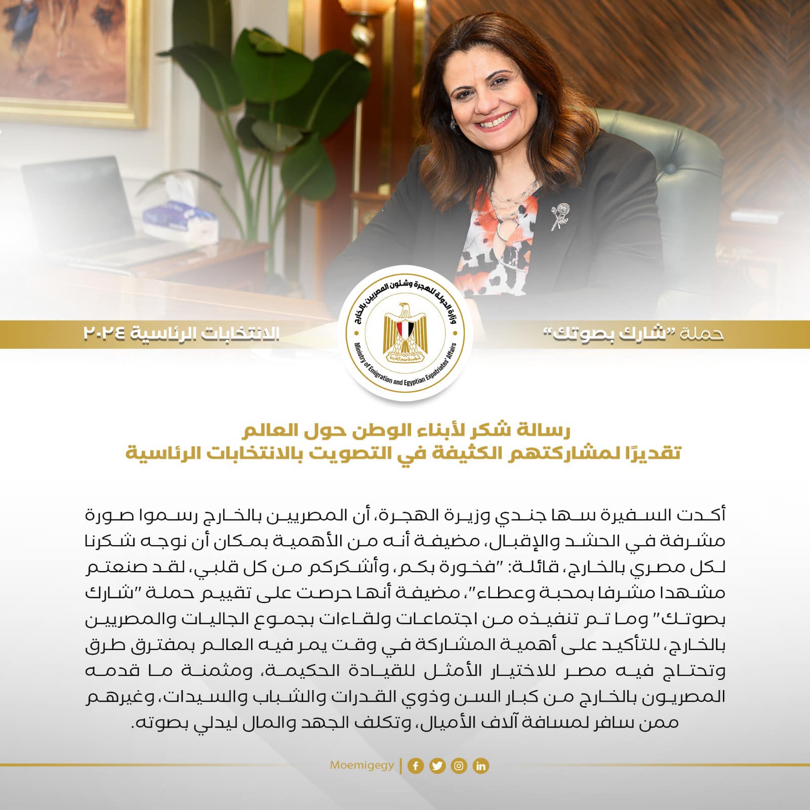 رسالة شكر لأبناء الوطن حول العالم تقديرًا لمشاركتهم الكثيفة في التصويت بالانتخابات الرئاسية