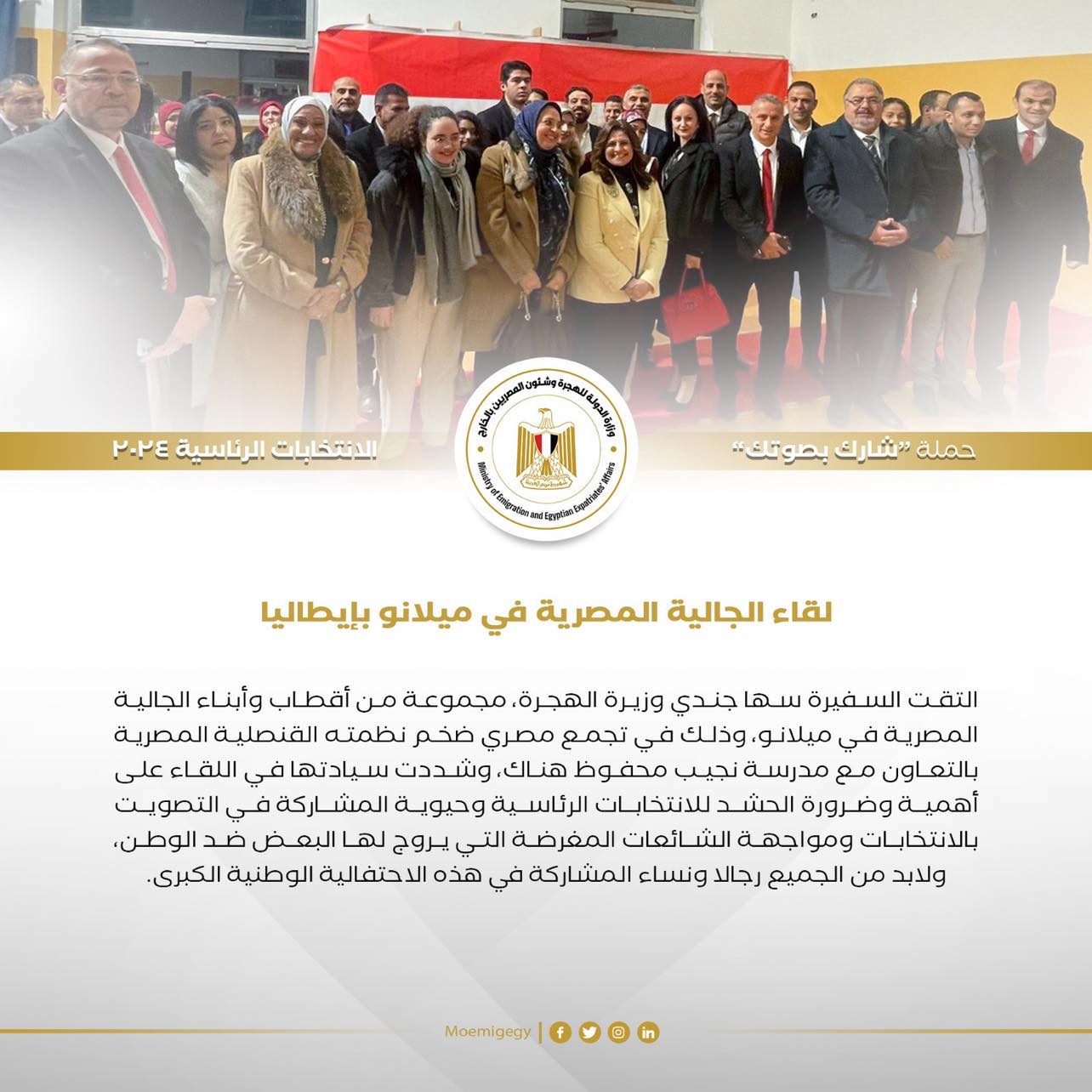 التقت السفيرة سها جندي وزيرة الهجرة، مجموعة من أقطاب وأبناء الجالية المصرية في ميلانو، وذلك في تجمع مصري ضخم نظمته القنصلية المصرية بالتعاون مع مدرسة نجيب محفوظ هناك، وشددت سيادتها في اللقاء على أهمية وضرورة الحشد للانتخابات الرئاسية وحيوية المشاركة في التصويت بالانتخابات ومواجهة الشائعات المغرضة التي يروج لها البعض ضد الوطن، ولابد من الجميع رجالا ونساء المشاركة في هذه الاحتفالية الوطنية الكبرى.
